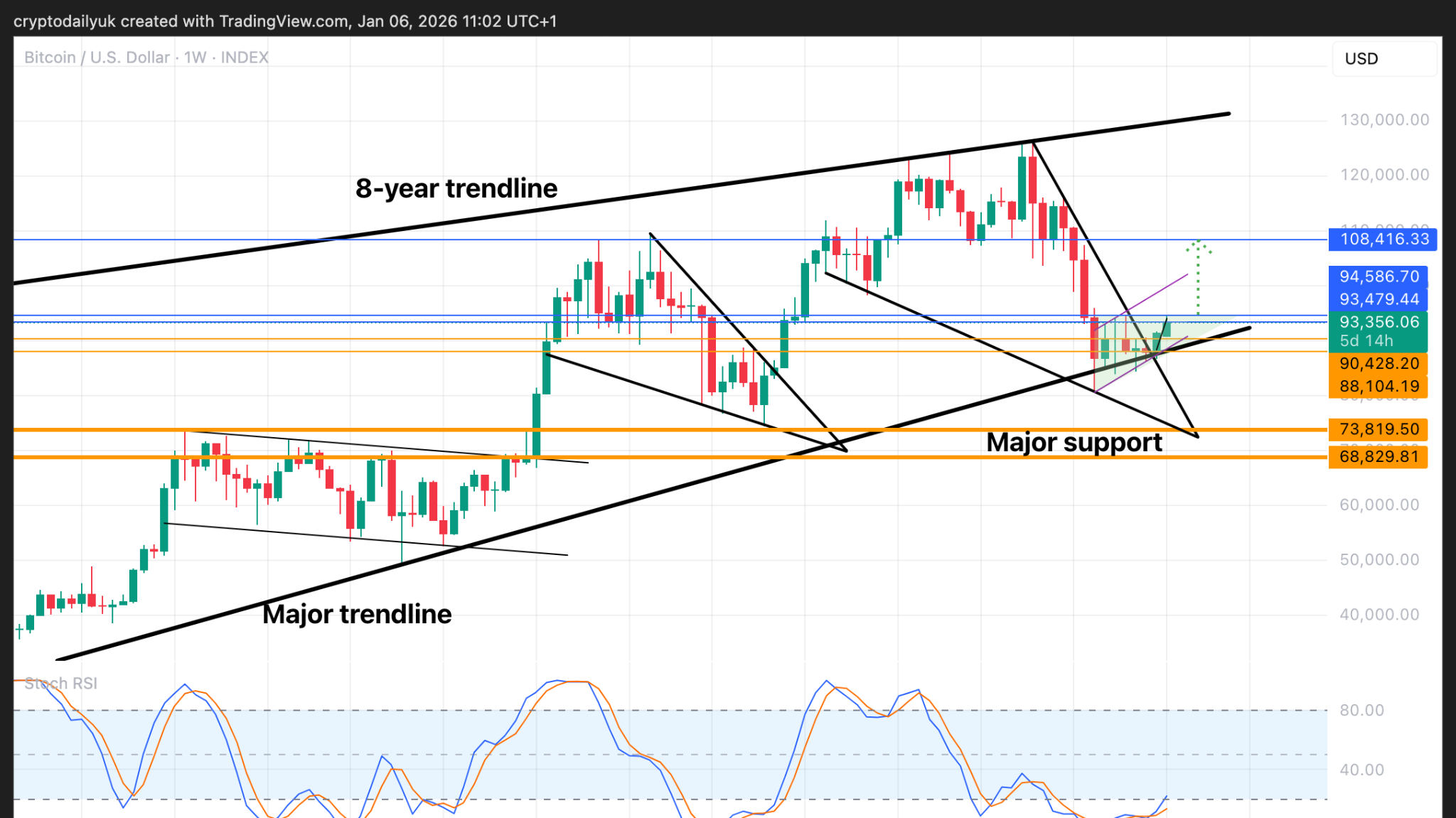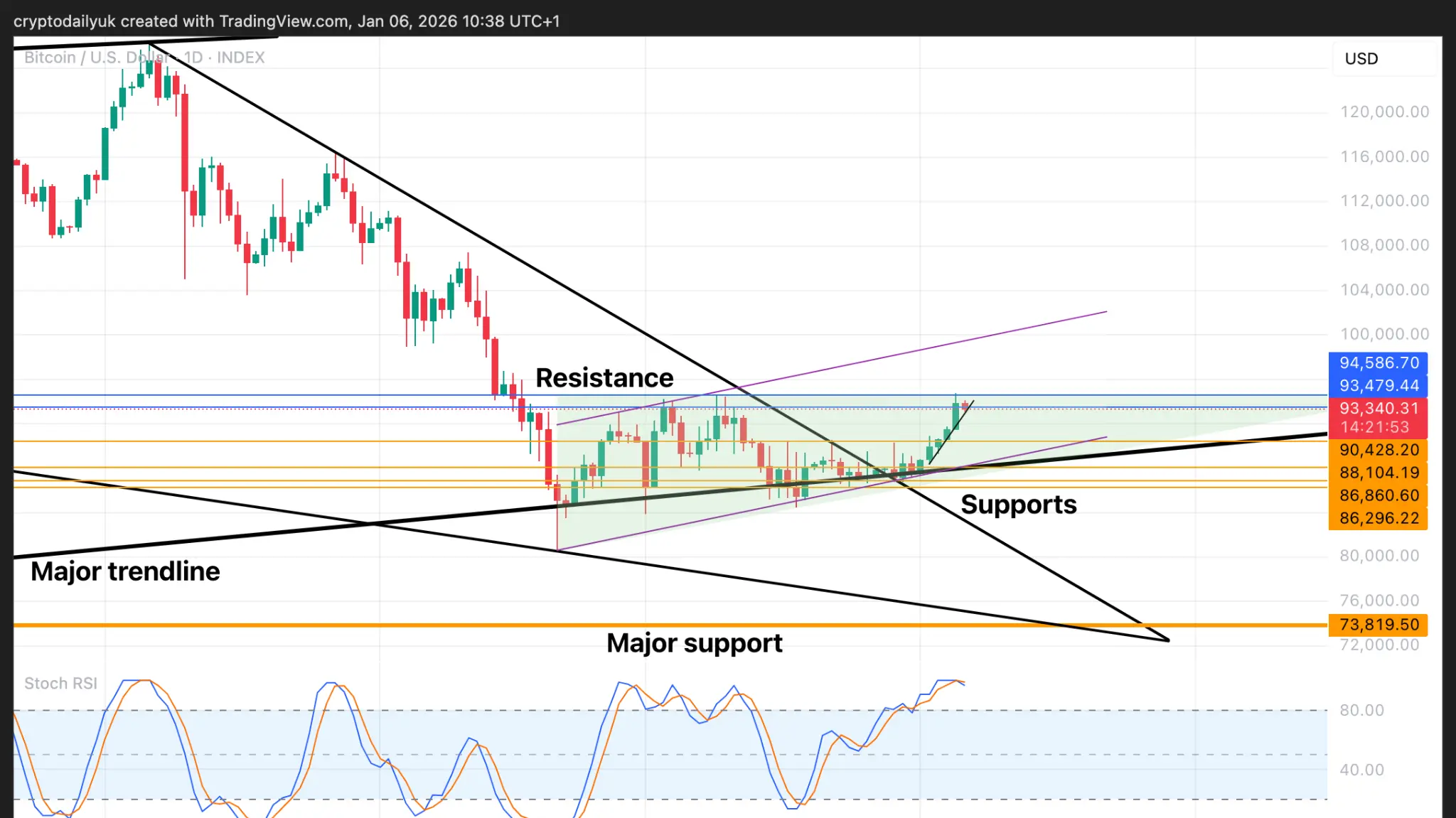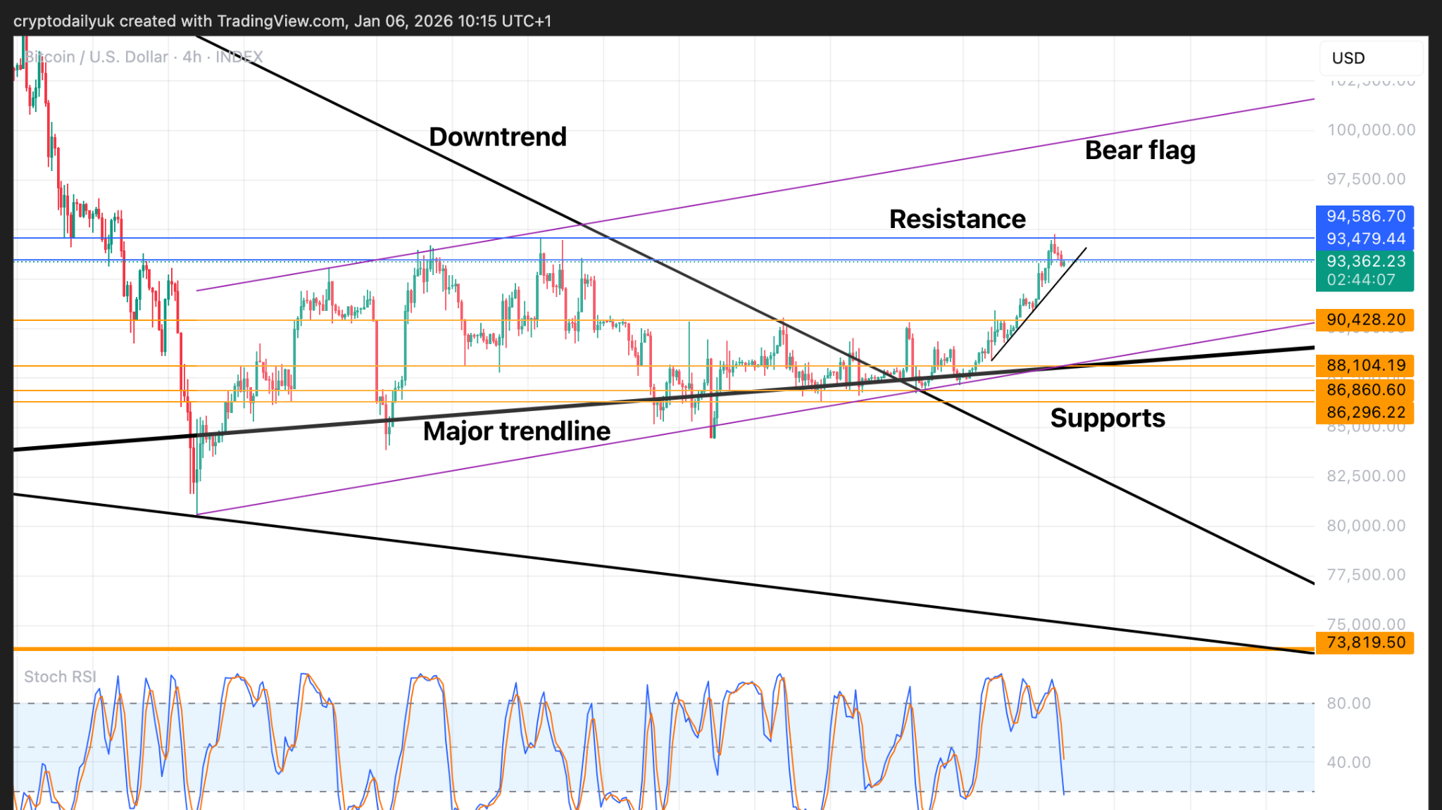 Como pode ser observado no RSI Estocástico, as linhas do indicador caíram muito rapidamente. Isso pode indicar que uma reversão potencial pode não descer muito. A linha de tendência curta que o preço está seguindo atualmente pode não se sustentar por muito tempo. Portanto, assim que o preço cair, pode parar em $90.400 ou nos suportes horizontais de $88.000. A linha de tendência inferior ascendente da bandeira de baixa pode ser outro alvo.
