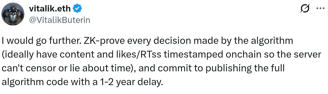 Buterin sugeriu um sistema verificável que empregue ZK-proofs para cada decisão tomada pelo algoritmo e que registre timestamps de todo o conteúdo, gostos e interações numa blockchain “para que o servidor não possa censurar ou mentir sobre o tempo.” A plataforma também deveria “comprometer-se a publicar o código completo do algoritmo com um atraso de 1-2 anos.”