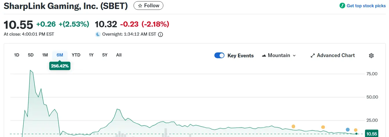 ! Цена SBET от SharpLink Gaming. Источник: Yahoo Finance.