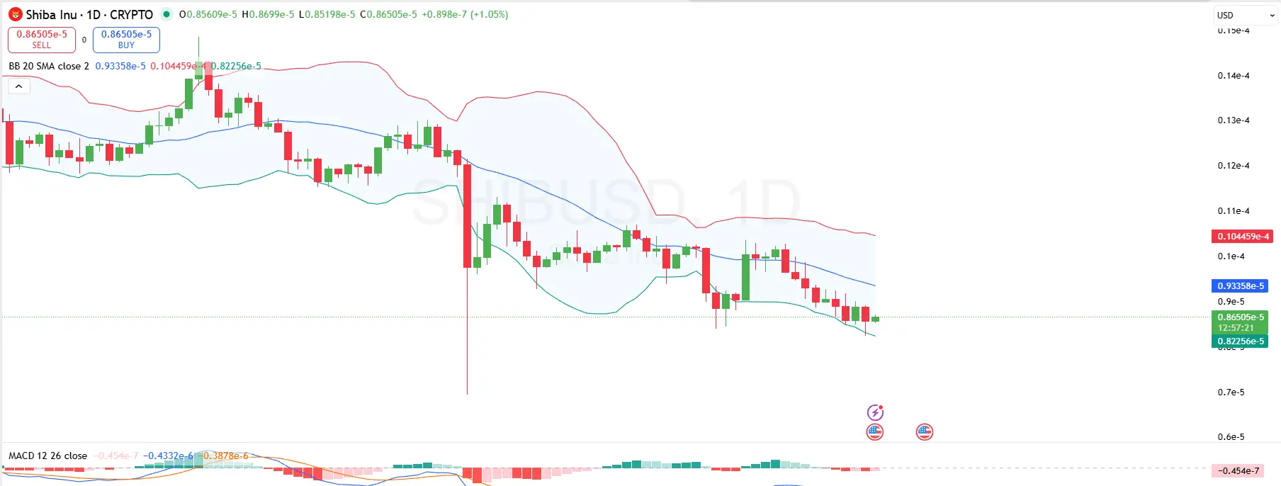 Смотря на технические графики, индикатор полос Боллинджера для Shiba Inu на дневном графике показывает ключевые уровни поддержки и сопротивления. В настоящее время цена находится выше нижней полосы Боллинджера (0.00000823), что часто сигнализирует о перепроданном состоянии или о периоде низкой волатильности.