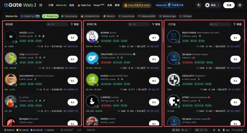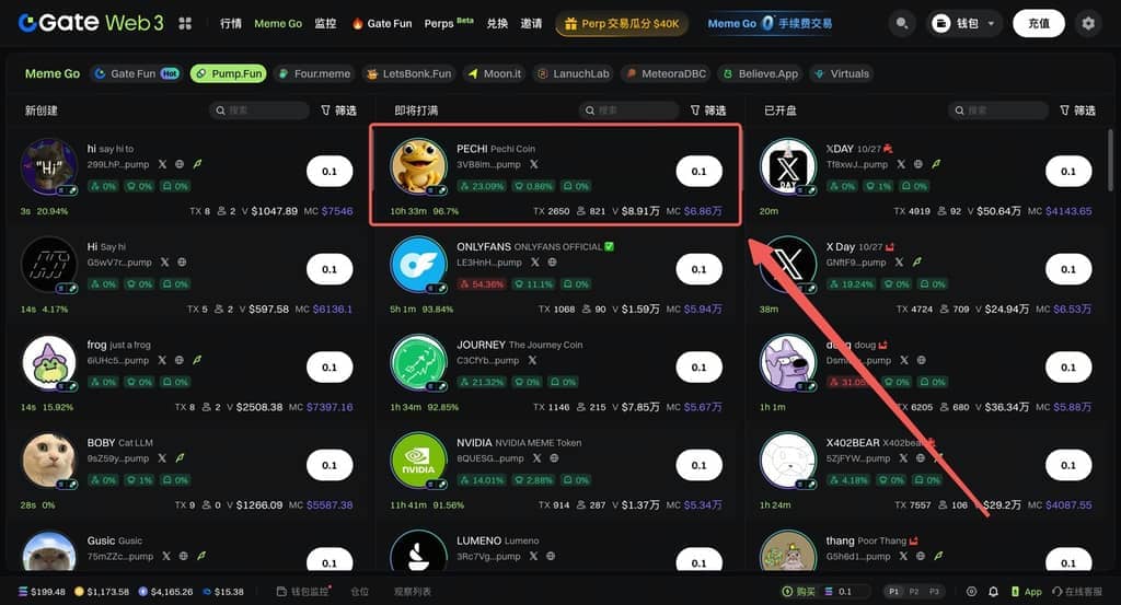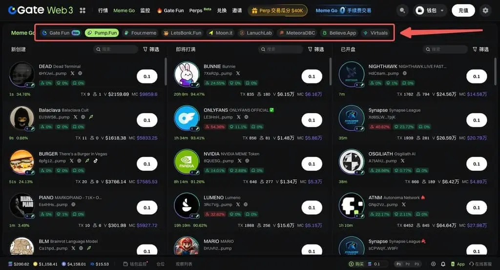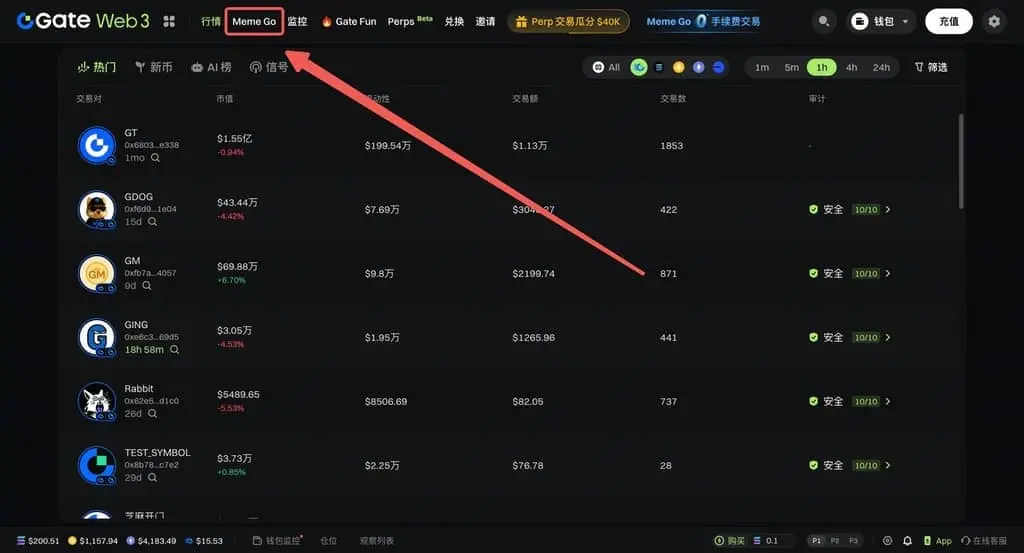 1)點擊 Gate Web3 功能欄的 Meme Go,進入 Meme Go 頁面