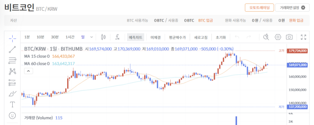 截至28日上午8:00,某交易所的BTC交易价格为169,071,000韩元,比前一天下跌0.30%。