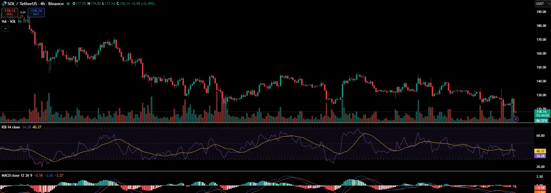 在撰写时,SOL 交易价格约为 $118 ,当天下跌超过2%,过去一周约下跌12%,主要山寨币的卖压持续增加。